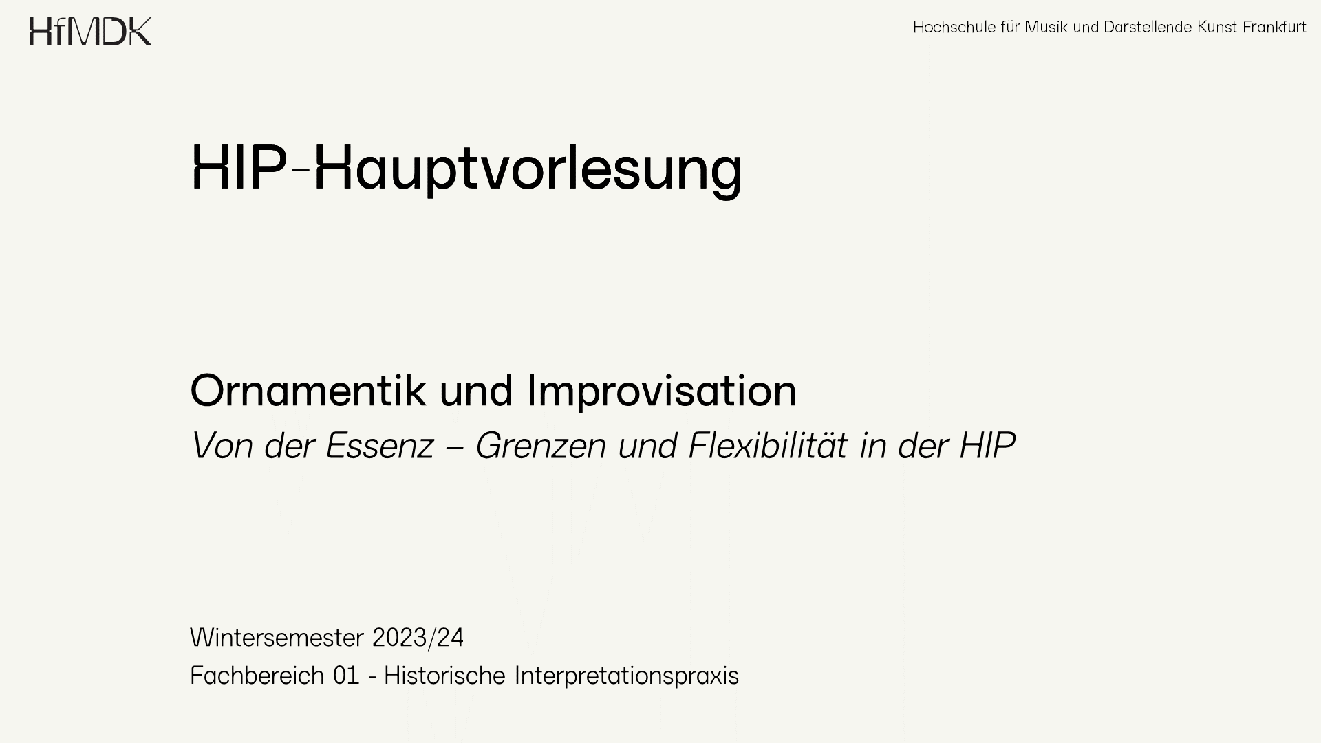 Unter dem Arbeitstitel „Von der Essenz - Grenzen und Flexibilität in der HIP“ werden dabei in diesem Semester in der Ringvorlesung und in ergänzenden Workshops spezifische Fragen zur stilistischen Vielfalt der Ornamente, zur Diminutionskunst, zum Umgang mit Patterns und „Schablonen“, zu improvisierten Elementen in den verschiedenen Bereichen der Alten Musik, aber auch zur Bedeutung des Improvisierens auch für ausgeschriebene Musik und im weiteren Sinn für unseren flexiblen und kompetenten Umgang mit den Erfordernissen des professionellen Musizierens sowie instrumentenspezifische Aspekte behandelt. Eingeladen sind Dozent*innen aus unterschiedlichen Fachbereichen der HfMDK und Gastdozierende aus der internationales Szene der Alten Musik.